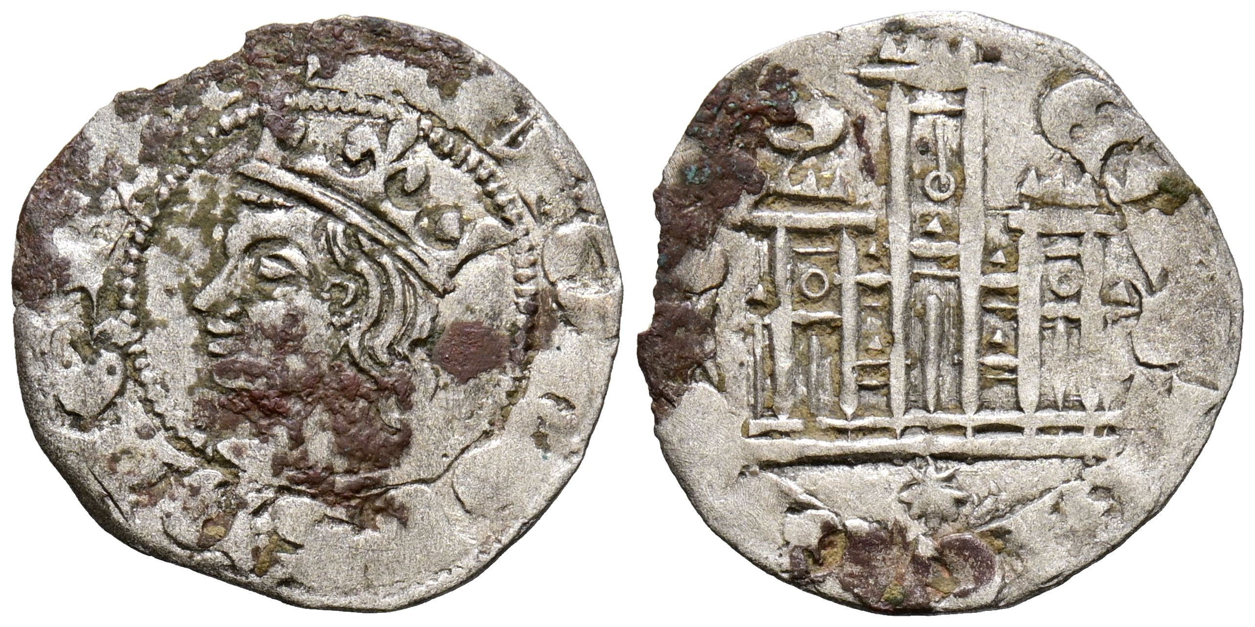 ALFONSO XI (1312-1350). Dinero Coronado/Cornado. (Ve. 0,84g/18mm). Coruña. (Imperatrix A11:3.5; FAB-343.1). Anv: Busto coronado de Alfonso XI a izquierda dentro de gráfila de puntos, alrededor leyenda: ALFONSVS REX. Rev: Castillo, debajo venera estrellada, todo dentro de gráfila de puntos, alrededor leyenda: CASTELLE ET LEGIONIS. MBC. Concreciones.