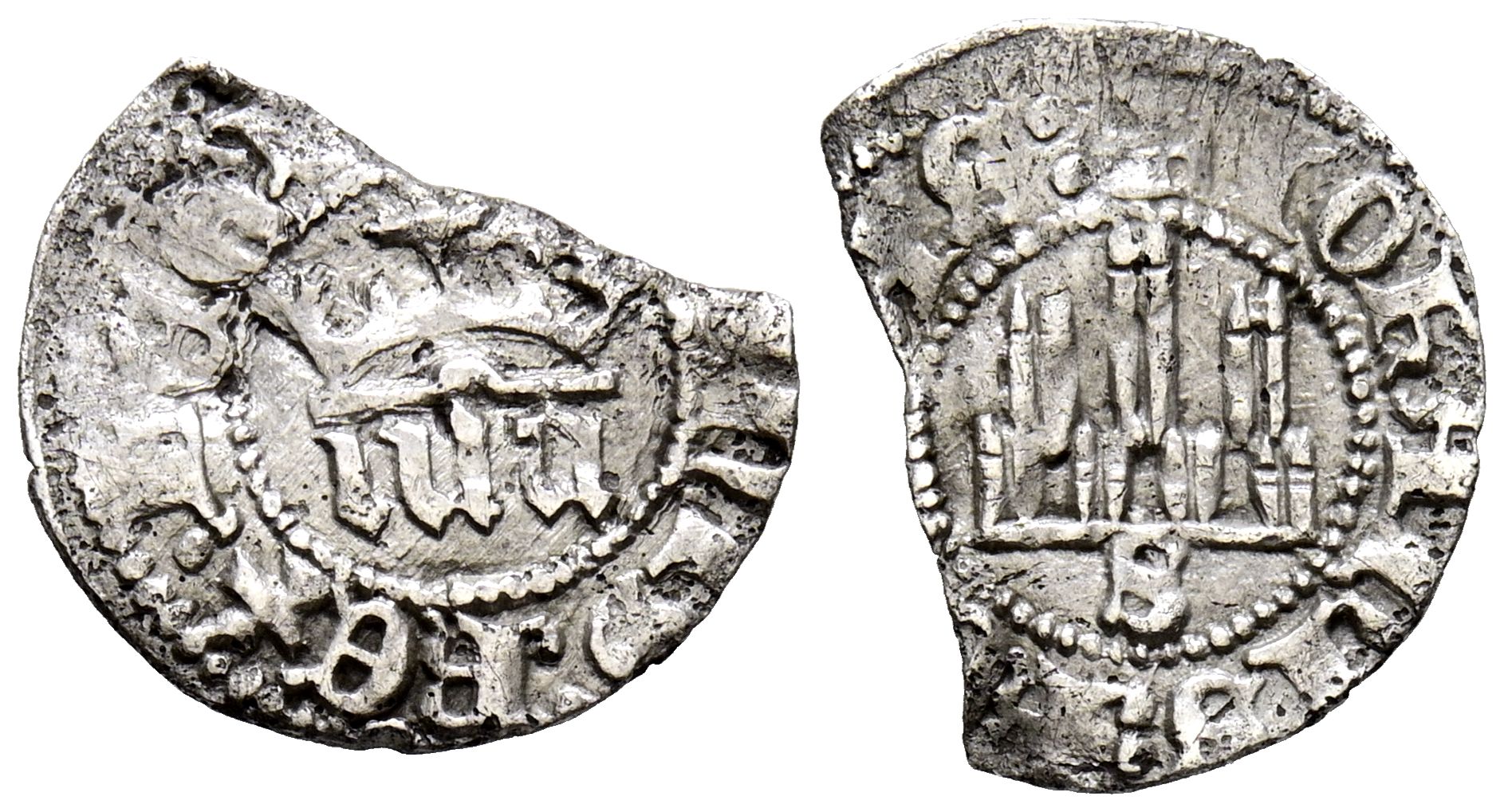 Juan I (1379-1390). 1/6 Real. (Ar. 0,41g/14mm). Sevilla. (Imperatrix J1:3.6; FAB-543). Anv: IOH coronadas dentro de gráfila circular, alrededor leyenda: IOHANIS REX E LEGI. Rev: Castillo, debajo S, todo dentro de una gráfila circular, alrededor leyenda: IOHANIS RESX CAS. MBC-. Falta en cospel.