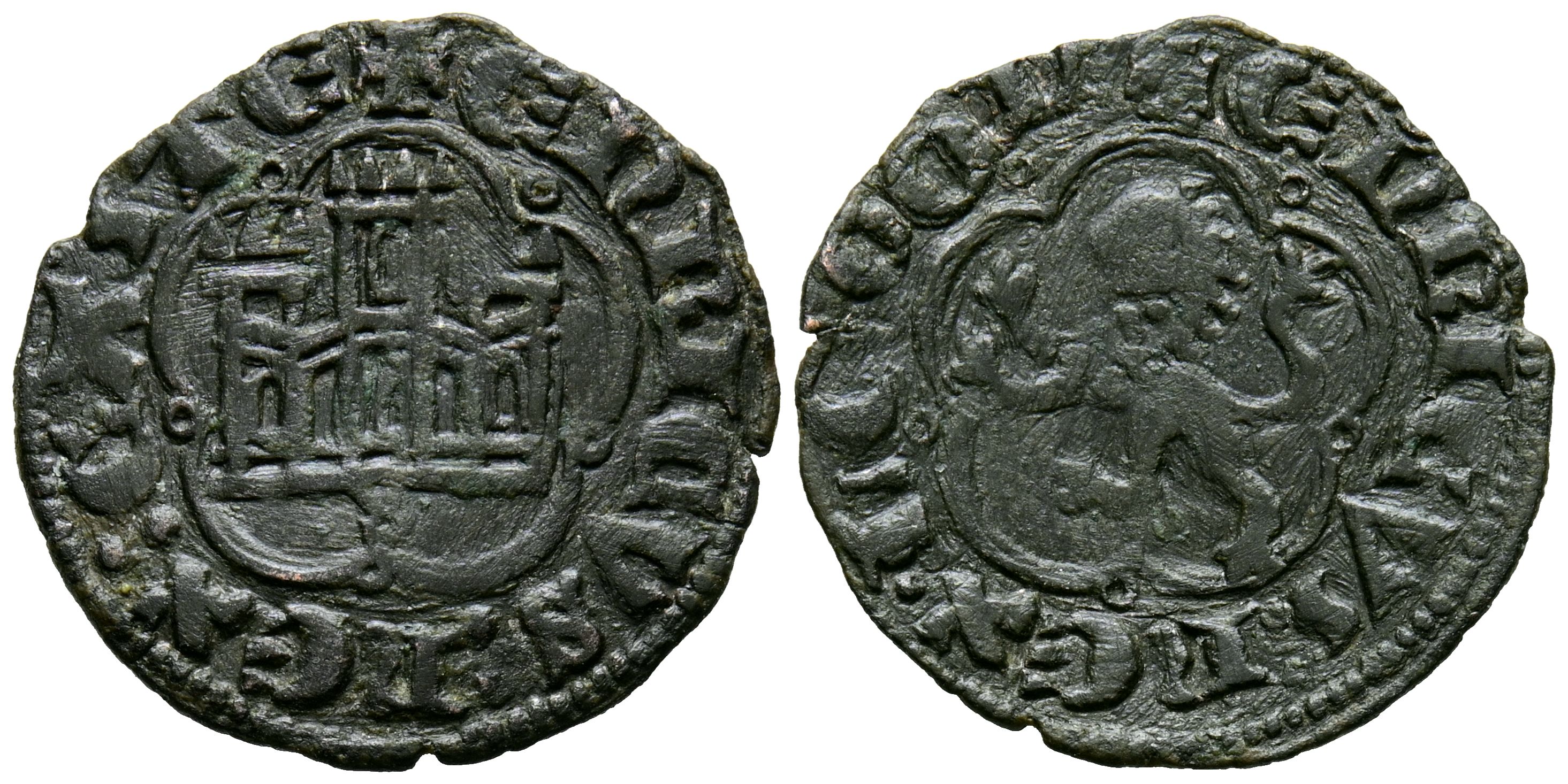 ENRIQUE III (1390-1406). 1/2 Blanca. (Ae. 1,30g/20mm). Sevilla. (Imperatrix E3:4.2, FAB-607). Anv: Castillo, debajo S, todo dentro de gráfila lobular, alrededor leyenda: ENRICVS REX CASTE. Rev: León a izquierda dentro de gráfila lobular, alrededor leyenda: ENRICVS REX LEGOON. MBC+.