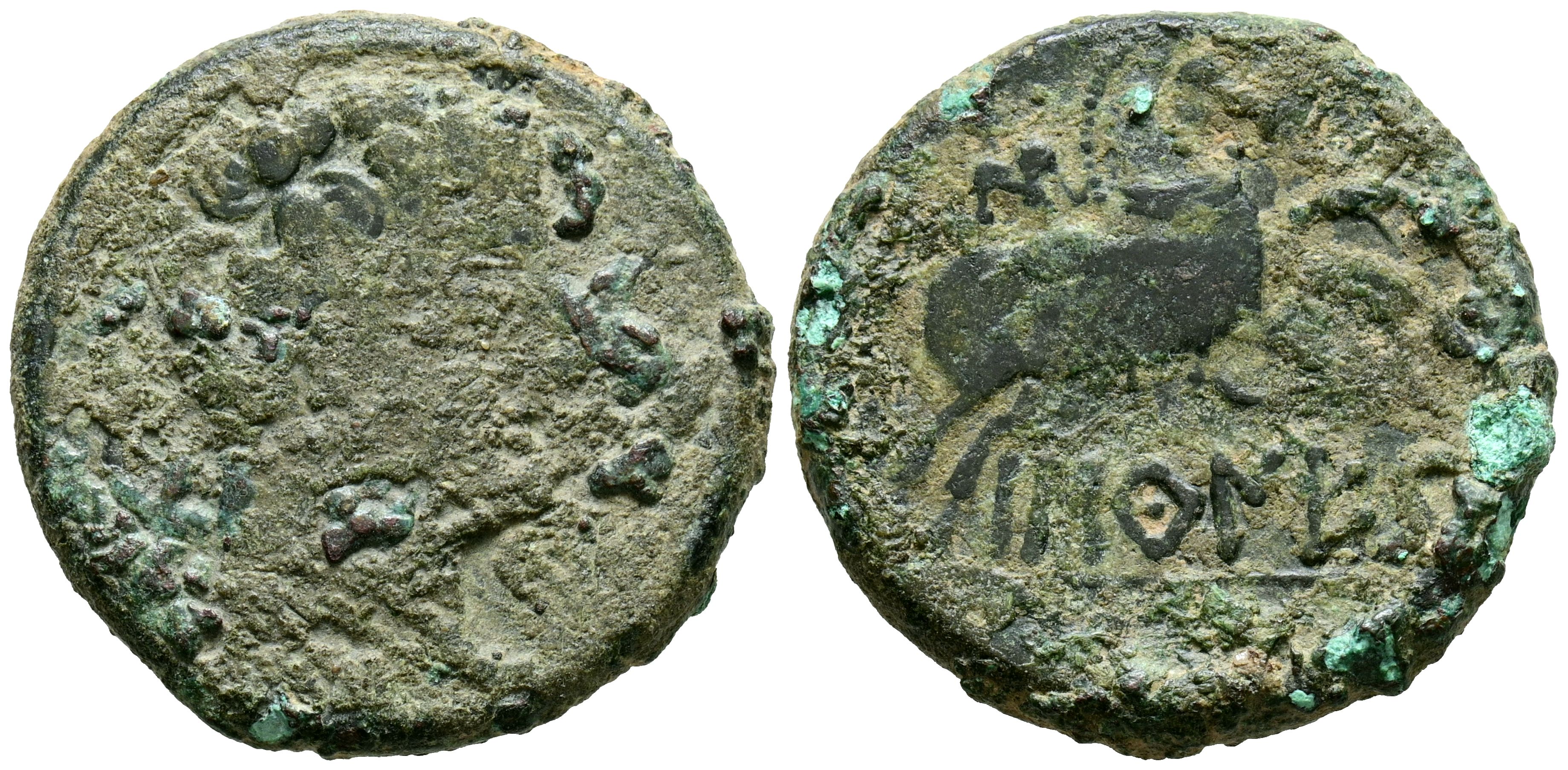 BASCUNES (Pamplona). As. (Ae. 10,55g/25mm). 120-20 a.C. (FAB-217). Anv: Cabeza barbada a derecha, entre dos delfines. Rev: Jinete con espada a derecha, debajo leyenda ibérica: BaSCUNES. BC+. Limpiado. Oxidaciones.