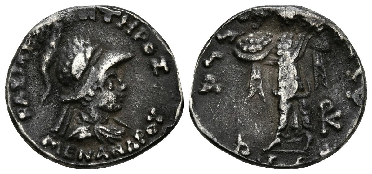 BAKTRIA. Menander I Soter. Dracma. 155-130 a.C. Indo-Grecia. A/ Busto drapeado con coraza y casco con penacho a derecha, alrededor leyenda griega. R/ Athena Alkidemos avanzando a izquierda portando escudo decorado con aegis y lanzando rayo, a su derecha monograma y alrededor leyenda Karosthi. Mitchiner 218b; Bopearachchi 16e; SNG ANS 868-73. Ar. 2,38g. Pátina. MBC.