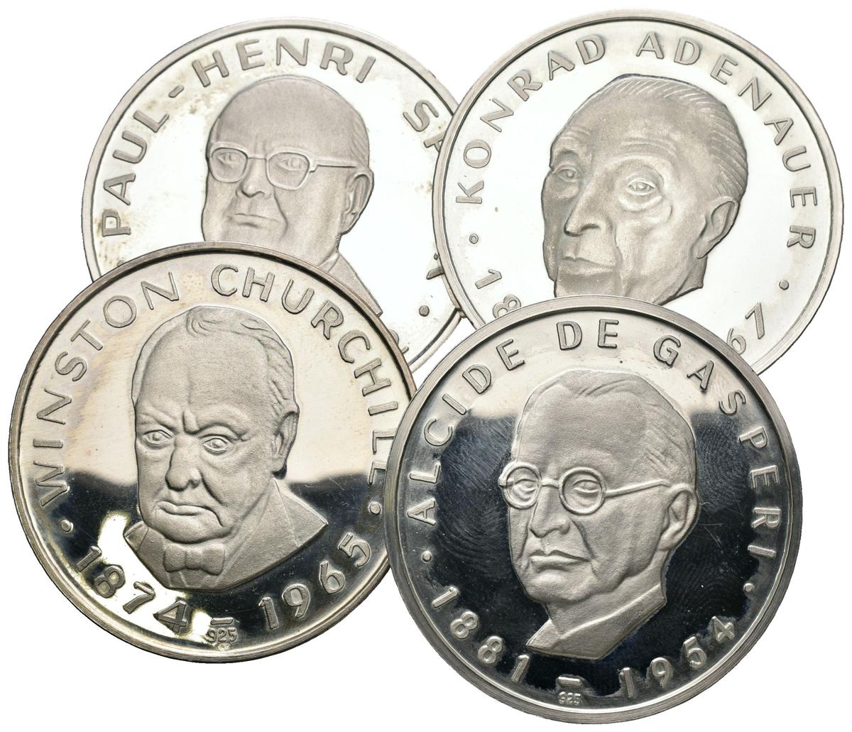MEDALLAS. Lote compuesto por 4 medallas de plata tipo Thaler de personalidades: Winston Churchill, Konrad Adernauer, Paul-Henri Spaak y Alcide de Gasperi. EBC. A EXAMINAR.