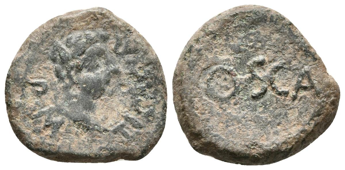 BOLSCAN-OSCA. Cuadrante. Epoca de Tiberio. 14-36 d.C. Huesca. A/ Cabeza laureada de Tiberio a derecha, alrededor TI CAESAR P P. R/ Leyenda central OSCA. FAB-1940. Ae. 3,15g. BC+/MBC-. Escasa.