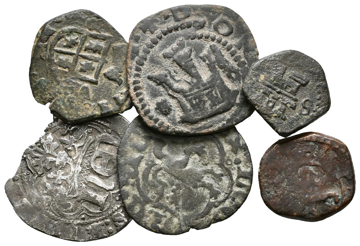 EPOCA MEDIEVAL Y MONARQUIA ESPAÑOLA. Lote compuesto por 6 monedas, conteniendo: Enrique III. 1/2 Blanca de Sevilla, 1/2 Real de Burgos; Felipe II. 2 Maravedís Coruña; Felipe III. 2 Maravedís Sevilla (2) y Felipe IV. 8 Maravedís 1661 Sevilla (Martillo). Ar/Ae. MBC-/MBC+. A EXAMINAR.