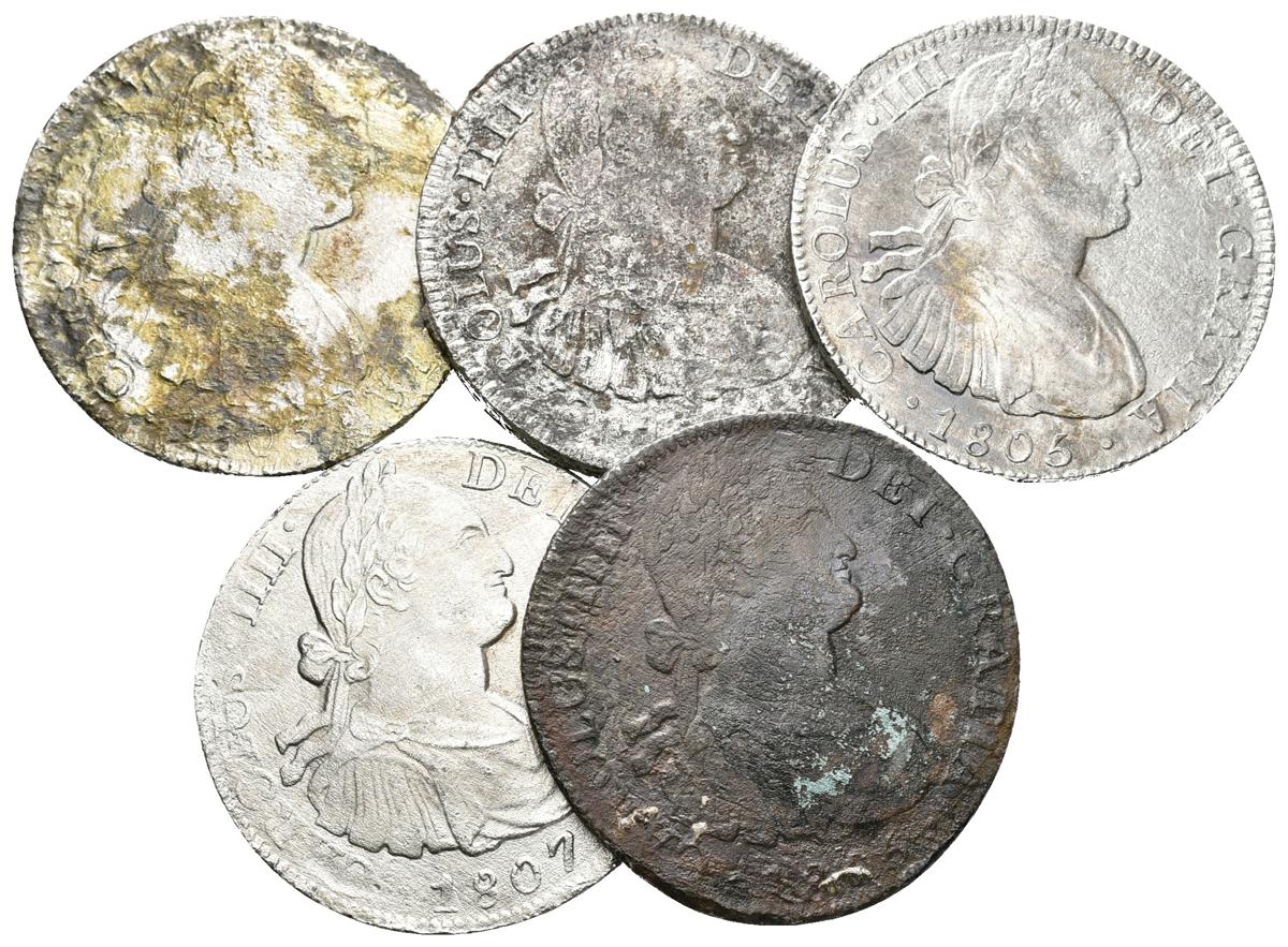 CARLOS IV. Lote compuesto por 5 monedas de 8 Reales de México. 1803 FT Cal-700, 1804 TH Cal-701, 1805 TH Cal-703, 1806 TH Cal-705 y 1807 TH Cal-707. Todos con oxidaciones marinas. Ar. BC+/MBC-. A EXAMINAR.