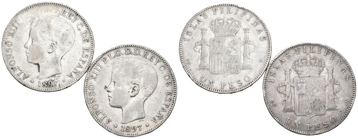 CENTENARIO DE LA PESETA. Lote compuesto por 2 monedas de 1 Peso pertenecientes al reinado de AlfonsoXIII: 1897 Manila SGV. Uno de ellos con leyenda manipulada. Cal-81. Ar. BC+. A EXAMINAR.