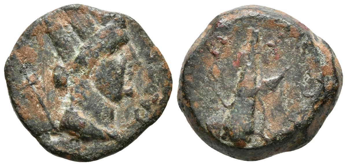 CARTEIA. Semis. Epoca de Augusto. 27 a.C.-14 d.C. San Roque (Cádiz). A/ Cabeza femenina con corona mural a derecha, delante tridente y CARTEIA. R/ Clava, arco y carcaj. M. FALCIDIVS. III. VIR. EX. S. C. F. C.. FAB-677. Ae. 6,81g. MBC/MBC-. Rara.
