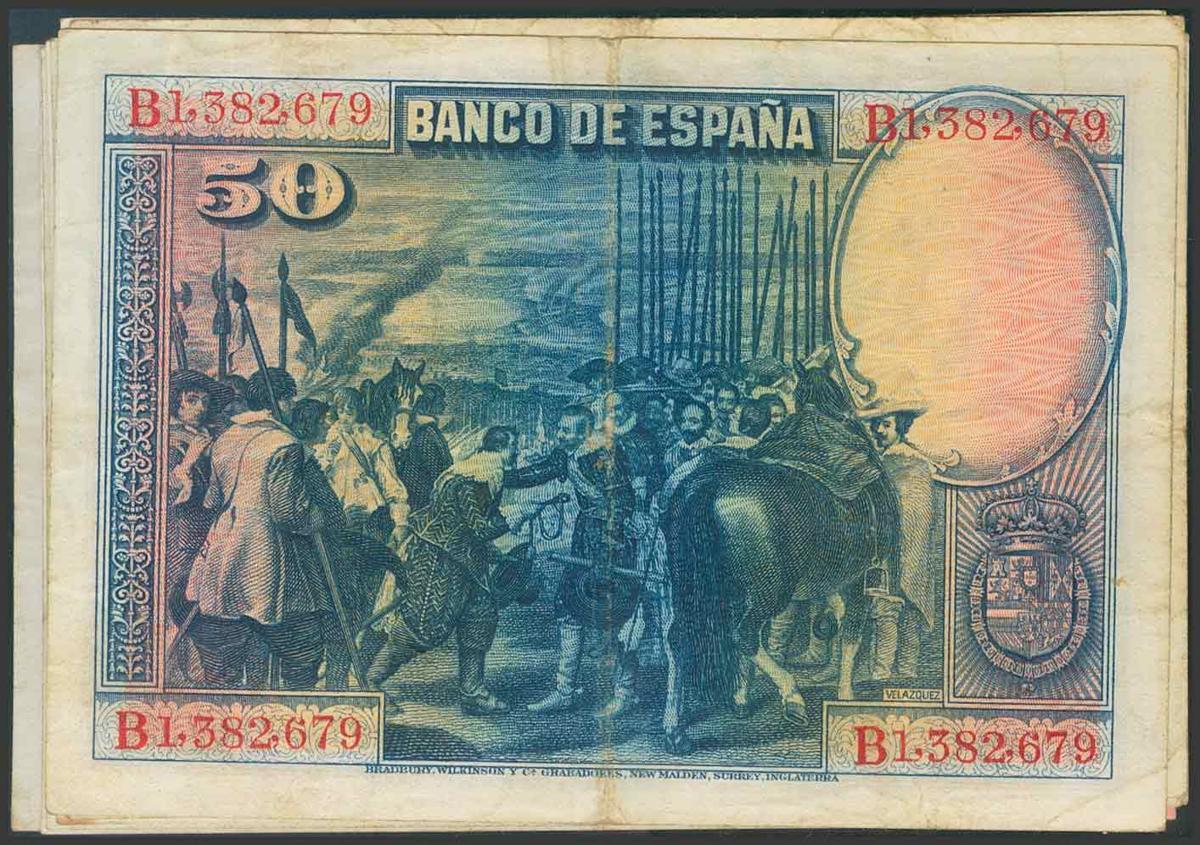 Conjunto de 10 billetes de 50 Pesetas de la emisión del 15 de Agosto de 1928. (Edifil 2017: 329a). BC.