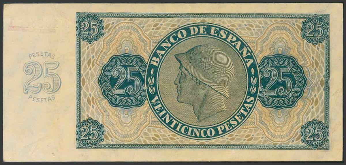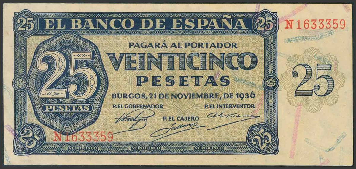 25 Pesetas. 21 de Noviembre de 1936. Serie N. (Edifil 2017: 419a). Imperceptible pliegue. Conserva casi todo el apresto original. EBC+.