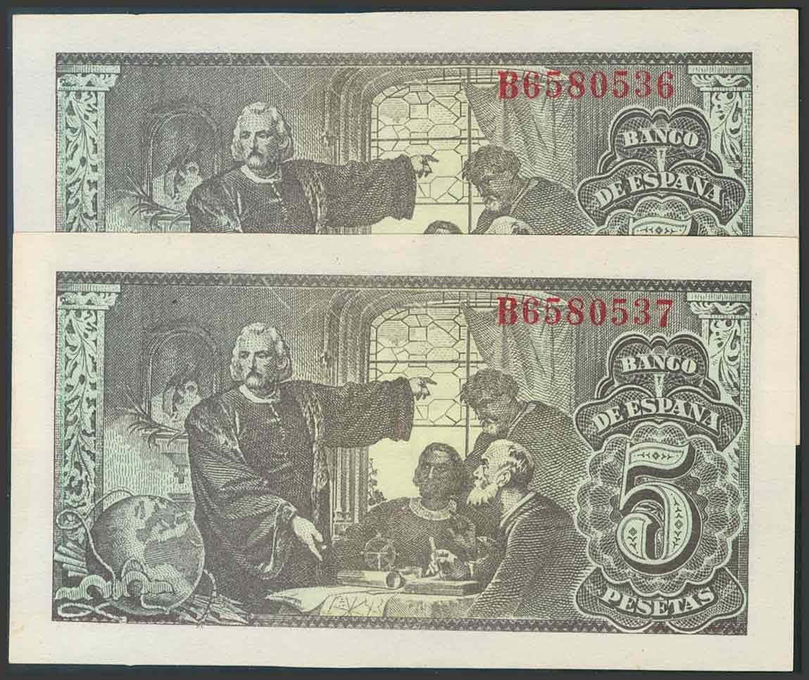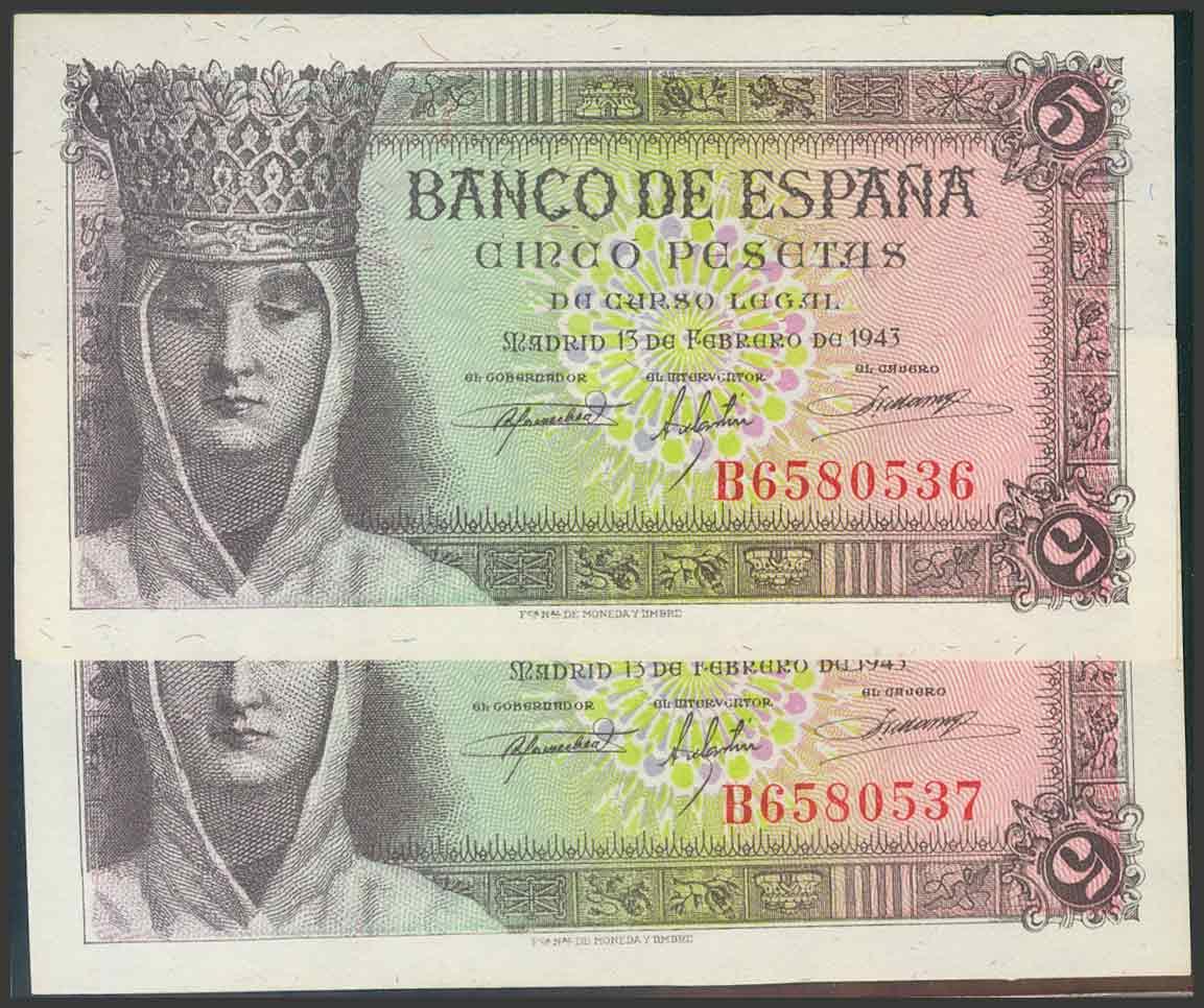 5 Pesetas. 13 de Febrero de 1943. Pareja correlativa. Serie B. (Edifil 2017: 446a). EBC+.