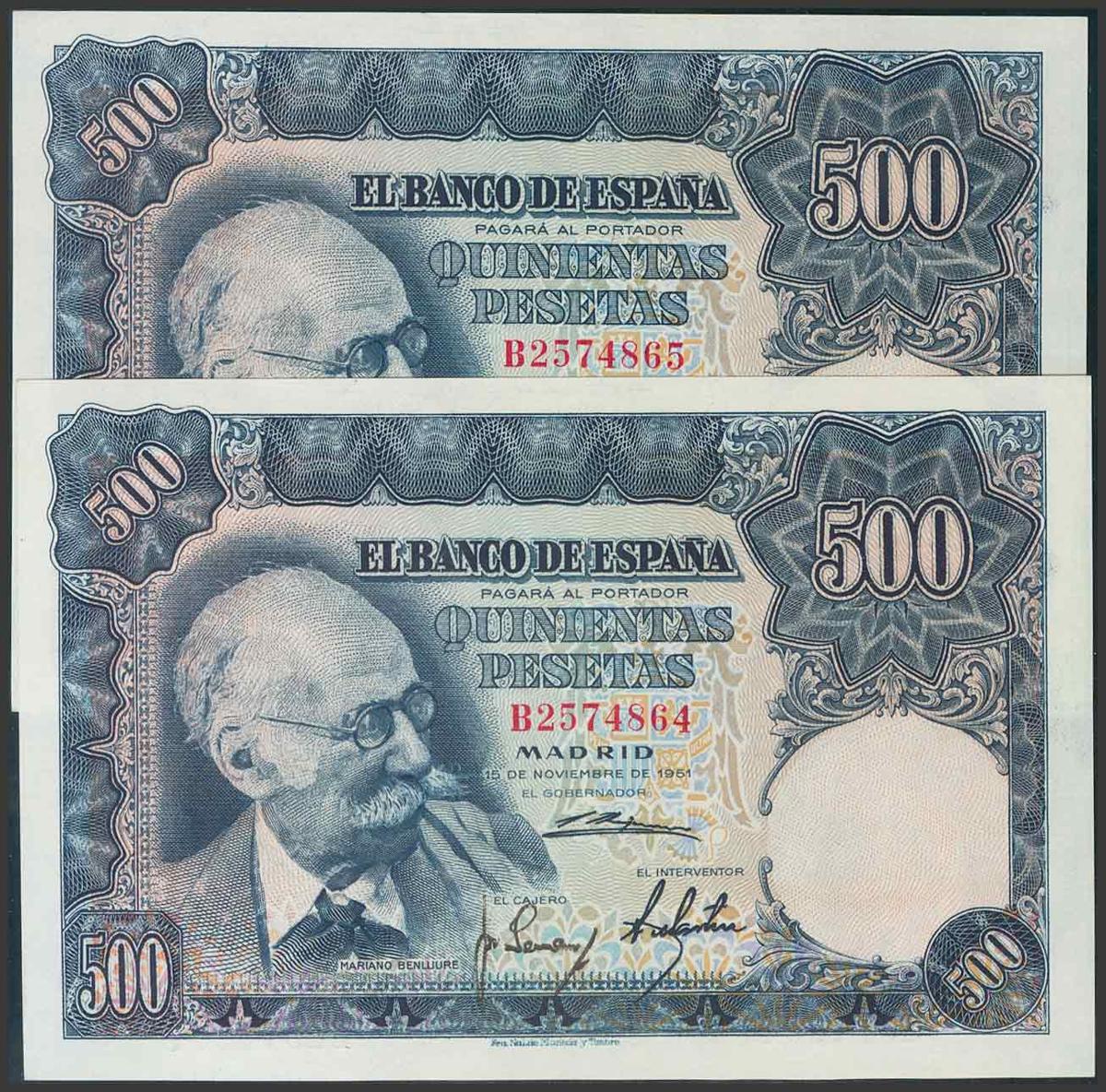 500 Pesetas. 15 de Noviembre de 1951. Pareja correlativa. Serie B. (Edifil 2017: 460a). Apresto original. Raros y especialmente en esta excepcional calidad. SC.