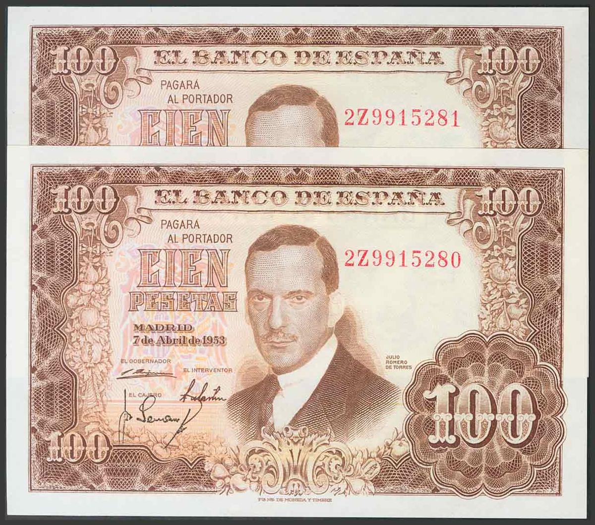 100 Pesetas. 7 de Abril de 1953. Pareja correlativa. Serie 2Z. (Edifil 2017: 464c). SC.