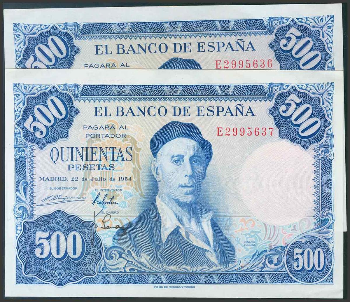 500 Pesetas. 22 de Julio de 1954. Pareja correlativa. Serie E. (Edifil 2017: 468b). EBC.