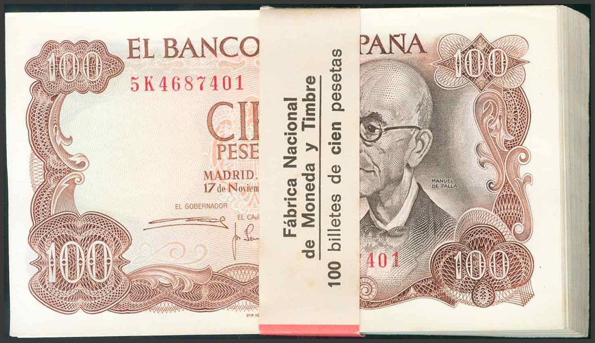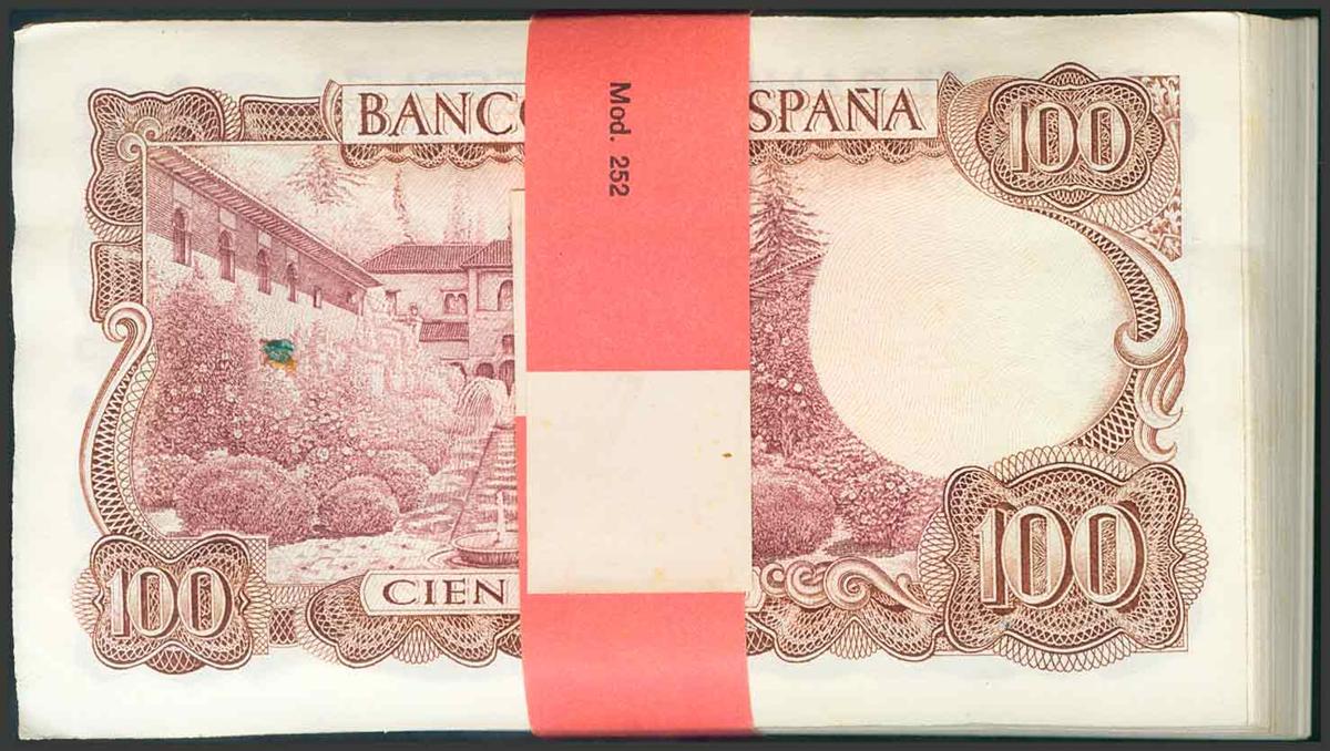 Conjunto de 100 billetes de 100 Pesetas emitidos el 17 de Noviembre de 1970, en "fajo" y con su precinto original de la serie 5K (Edifil 2017: 472c). SC/SC-.