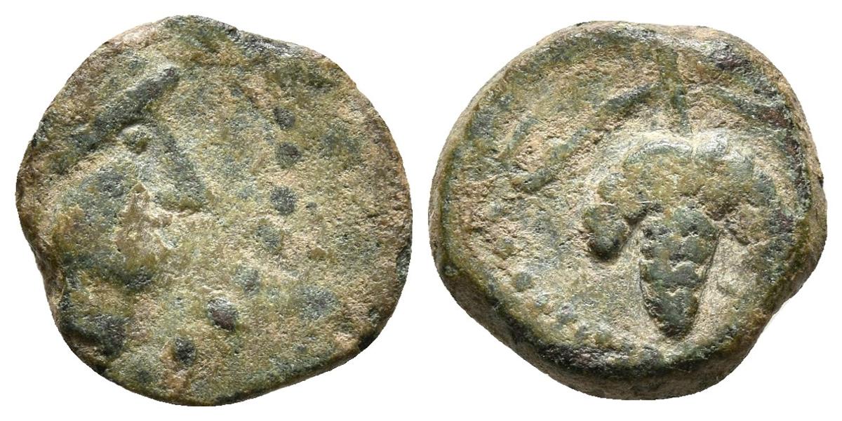 LIXUS. Ae. 50-1 a.C. Mauretania. A/ Cabeza de Chusor-Phat a derecha con gorro adornado con cuerda. R/ Racimo de uvas en vid. MAA 168; Mazard 633; SNG Copenhagen 694-6. Ae. 1,46g. MBC/MBC+. Muy escasa.