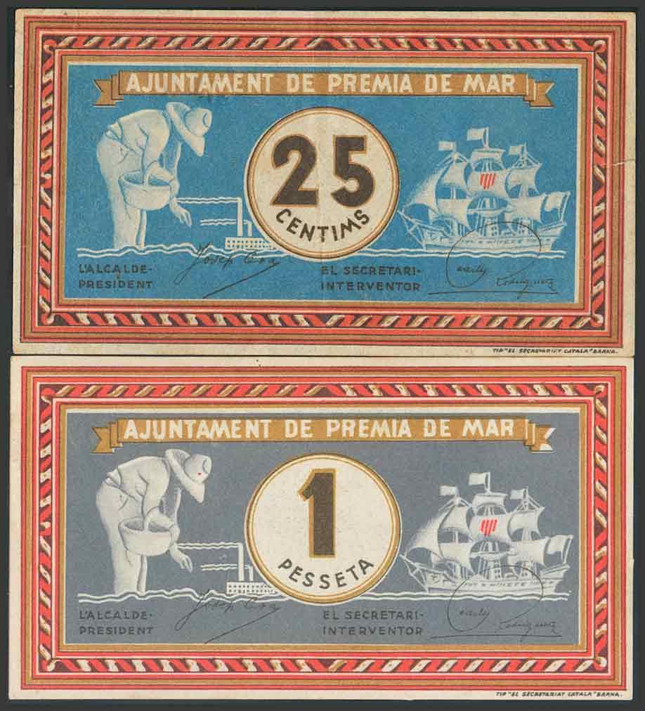 PREMIA DE MAR (BARCELONA). 25 Céntimos y 1 Peseta. (1940ca). Series D y B, respectivamente. (González: 9468, 9470). SC/MBC.