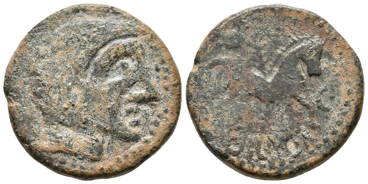 SISAPO. Semis. 50-20 a.C. Zona de Almadén (Ciudad Real). A/ Cabeza masculina a derecha. R/ Caballo al paso a derecha, por detrás palma, en la grupa pájaro, delante del pecho letra fenicia yod, debajo leyenda fenicia. FAB-2251. Ae. 9,93g. MBC-.