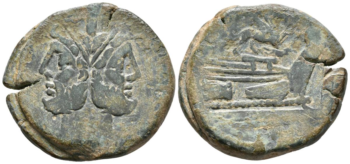ACUÑACIONES ANONIMAS. As. 169-158 a.C. Roma. A/ Cabeza de Jano bifronte, encima I marca de valor. R/ Proa de nave a derecha, encima Grifo a derecha, delante marca de valor I y debajo Roma. Craw 182.2; Sydenham 284; RBW 771. Ae. 24,78g. MBC.