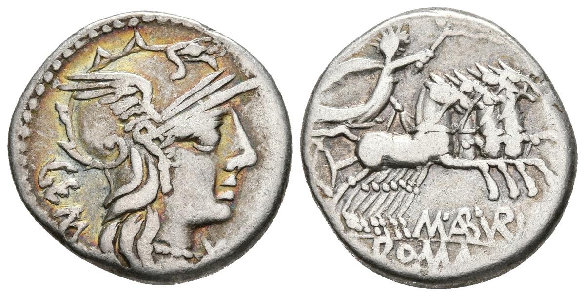 C. ABURIUS M.F. GEMINUS. Denario. 134 a.C. Roma A/ Cabeza de Roma a derecha, bajo el mentón signo de valor y detrás leyenda GEM. R/ Sol con látigo en cuádriga a derecha. Debajo leyenda M. ABURI, en exergo ROMA. Craw 250.1. Ar. 3,89g. Tono irisado. MBC.