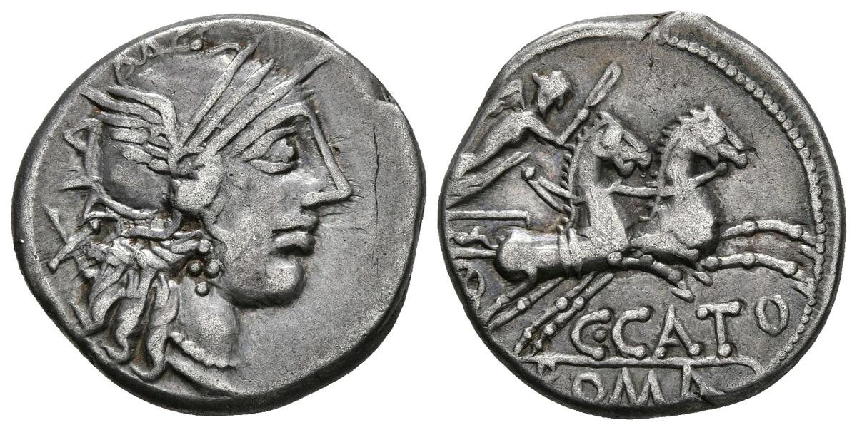C. PORCIUS CATO. Denario. 123 a.C. Roma. A/ Busto de Roma a derecha, detrás signo de valor X. R/ Victoria a las riendas de viga, portando látigo, debajo C·CATO. En exergo ROMA. Craw 274.1; RSC Porcia 1. Ar. 3,89g. MBC+.