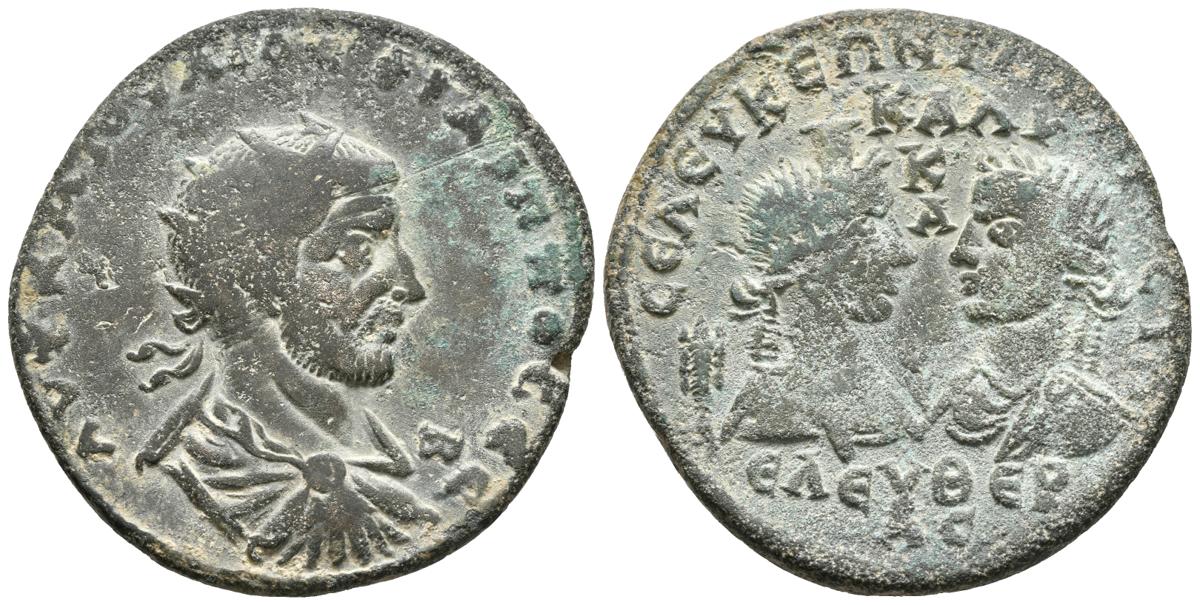 FILIPO I. Ae35. ¿Medallón?. 244-249 d.C. Cilicia. Seleucida y Calycadnum. A/ Busto radiado y drapeado con coraza a derecha. R/ Busto drapeado de Artemis-Tyche con cornucopia a derecha, frente a esta busto de Apollo con rama de laurel a izquierda. SNG BN 1039-42var; SNG Levante 777var. Ae. 18,45g-35mm. MBC/MBC+.