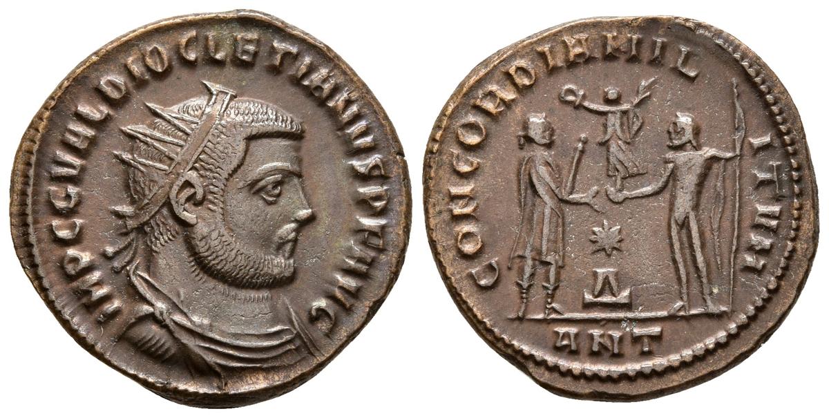 DIOCLECIANO. Antoniniano. 296 d.C. Antioquía. A/ Busto radiado y drapeado con coraza a derecha. IMP C C VAL DIOCLETIANVS P F AVG. R/ Diocleciano, estante a derecha portando cetro, recibiendo Victoria de Júpiter estante frente a él portando cetro, entre ellos *Delta. CONCORDIA MILITVM, en exergo ANT. RIC VI 621. Ae. 3,92g. EBC.Ex Col. Dattari.