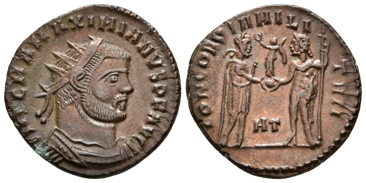 MAXIMIANO. Antoniniano. 295-261 d.C. Heráclea. A/ Busto radiado con coraza a derecha. IMP C M A MAXIMIANVS P F AVG. R/ Emperador estante a derecha con atuendo militar, frente a él Júpiter entregándole Victoria y portando cetro, entre ellos H y Gamma. CONCORDIA MILITVM. RIC 14. 3,34g. EBC/EBC-.Ex Col. Dattari.