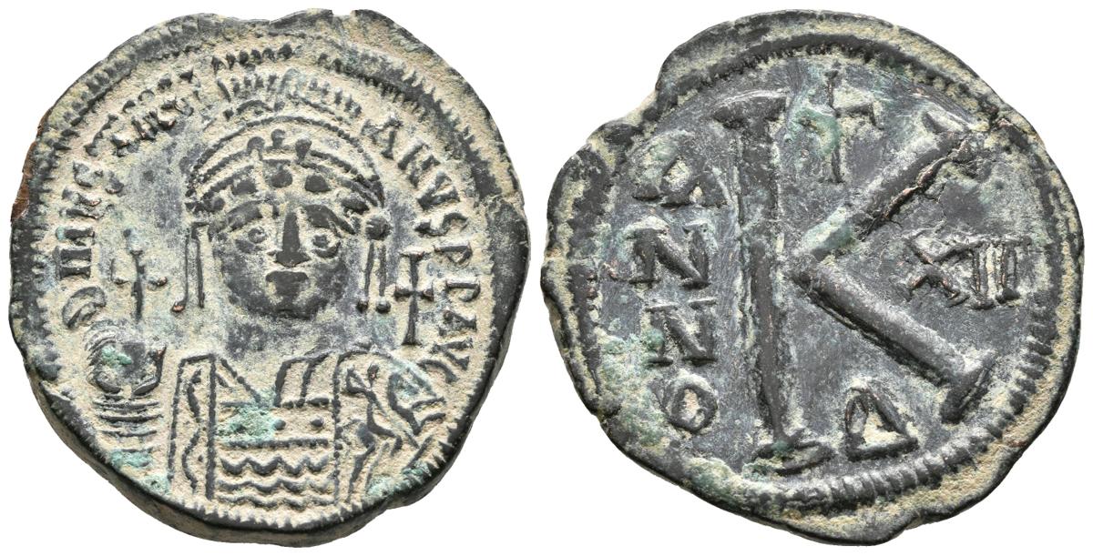 JUSTINIANO I. 1/2 Nummus. 538-539 d.C. RY 12. Constantinopla. A/ Busto de frente con casco, sosteniendo globo crucífero y escudo decorado con jinete alanceando enemigo, a la derecha en el campo cruz. D N IVSTINIANVS P P AVG. R/ En el centro K grande, encima cruz, debajo delta, a ambos lados ANNO-XII. Sear 165. Ae. 12,68g. MBC+.