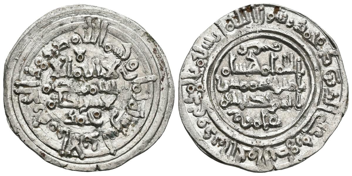 CALIFATO DE CORDOBA. Hisham II. Dirham. 380H. Al-Andalus. Citando a Muhammad en la IA y ´Amir en la IIA. Error en la fecha 308H (Año imposible, correspondiente a Abd Al-Rahman III) en lugar de 380H. Vives 538. Ar. 2,94g. EBC-. Escasa.
