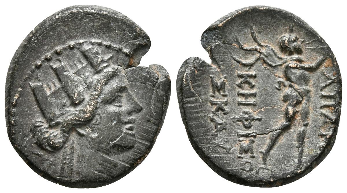 PHYRGIA, Apameia. Ae18. 133-48 a.C. Guerras civiles. Magistrado Pankr. A/ Busto de Artemisa-Tyche con corona mural a derecha. R/ Marsyas desnudo avanzando a derecha tocando aulos. HGC 7, 674; BMC 62. Ae. 3,03g. MBC+.