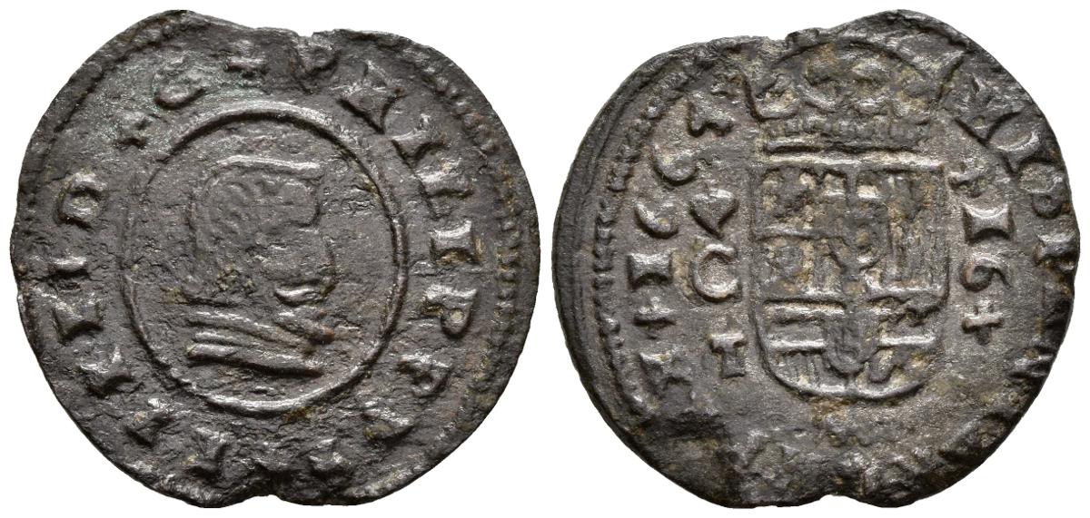 FELIPE IV. 16 Maravedís. 1664. Córdoba T. Fecha cerrada +1664+. Cal-1286; J.S. M-68 var. Ae. 4,02g. MBC-. Escasa.