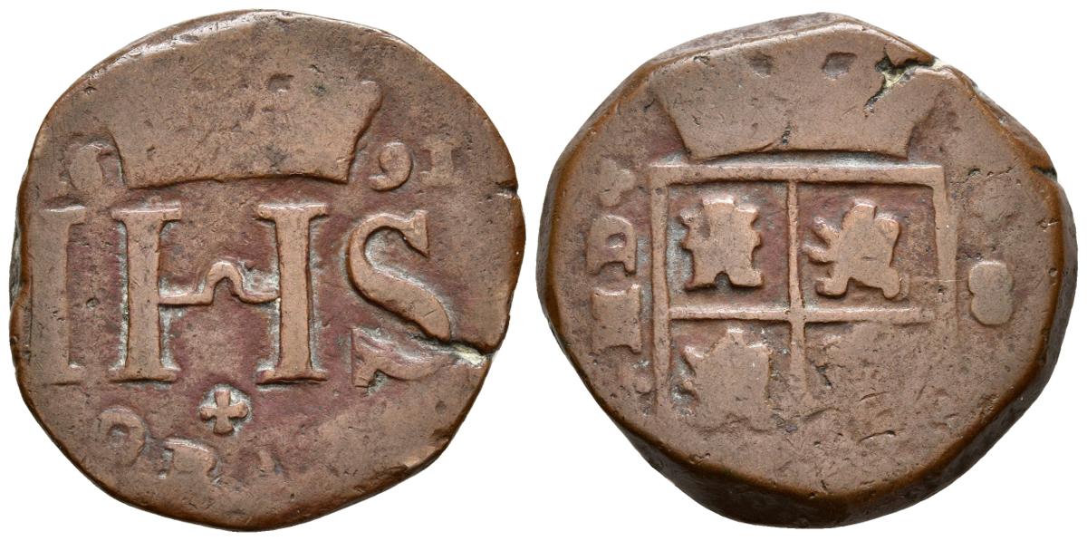 CARLOS II. 8 Maravedís. 1691. Madrid. Acuñada para el comercio con Orán. Cal-296; J.S. Q-07. Ae. 12,85g. MBC-. Rara.