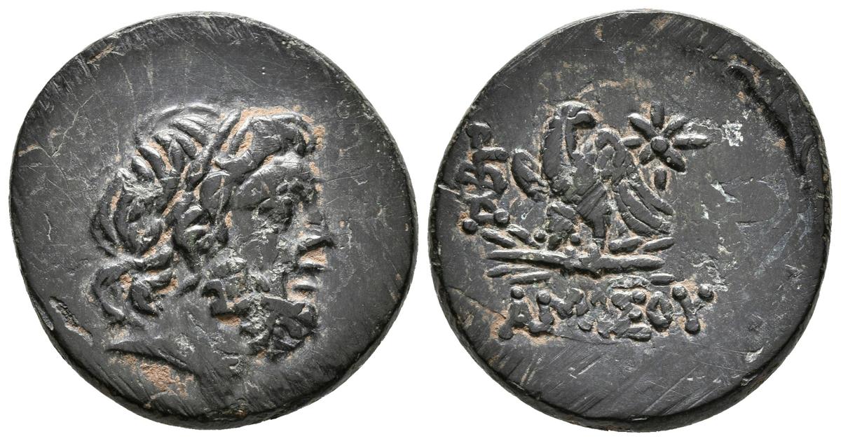 PONTOS, Amisos. Ae23. Tiempos de Mithradates VI. 120-85 a.C. A/ Cabeza laureada de Zeus a derecha. R/ Aguila estante a izquierda sobre rayo con la cabeza vuelta, a la izquierda monograma, a la derecha estrella. En exergo AMIEOY. SNG BM Black Sea 1227. Ae. 6,91g. Acuñada sobre otra moneda tipo SNG BM Black Sea 1187. MBC.