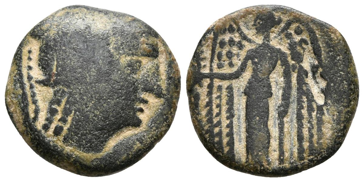 REINO NABATEO. Acuñación anónima que imita las estáteras macedonias de Alejandro III y Philipo I. Ae17. 135-9 a.C. A/ Cabeza con casco de Athena a derecha. R/ Victoria avanzando a izquierda portando corona y palma. Meshorer, Nabataea 1. Ae. 4,52g. MBC-/MBC.