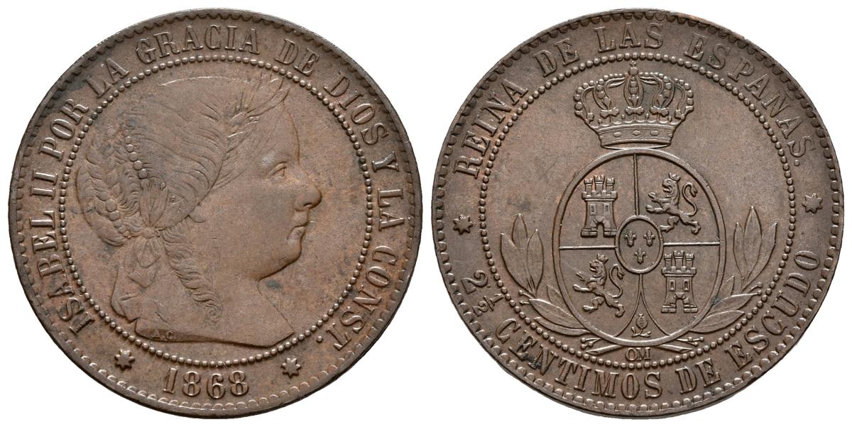 ISABEL II. 2 1/2 Céntimos de escudo. 1868. Sevilla OM. Cal-650. Ae. 6,25g. EBC-.