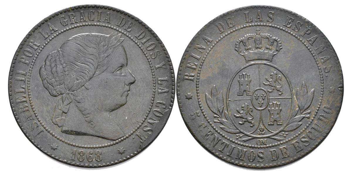 ISABEL II. 5 Céntimos de escudo. 1868. Sevilla OM. Cal-634. Ae. 11,97g. Pátina verde. MBC-.