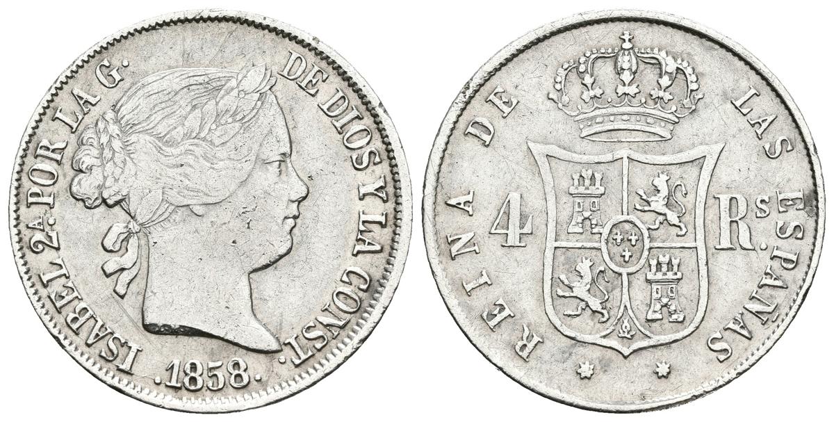 ISABEL II. 4 Reales. 1858. Sevilla. Cal-328. Ar. 5,09g. MBC. Escasa.