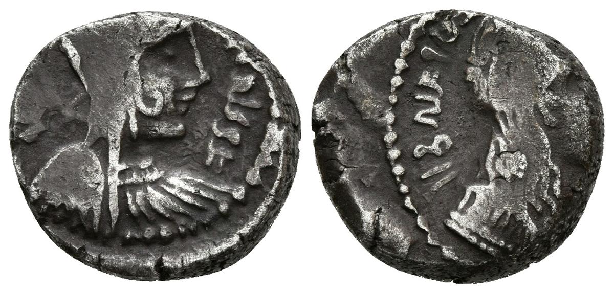 REINO NABATEO. Aretas IV con Huldu. Dracma. RY7= 3/2 a.C. Petra. A/ Cabeza laureada de Aretas a derecha. R/ Busto velado y drapeado de Huldu a derecha. DCA 973. Ar. 3,79g. Reverso desplazado. MBC. Escasa.