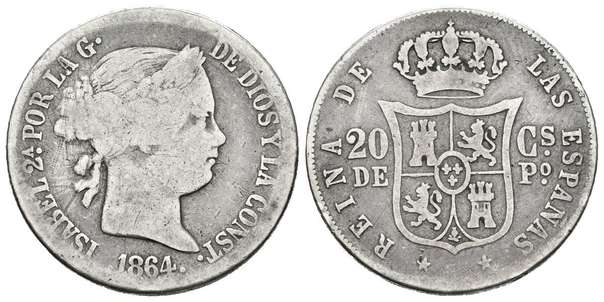 ISABEL II. 20 Centavos de Peso. 1864. Manila. Cal-456. Ar. 4,89g. BC+. Rara.