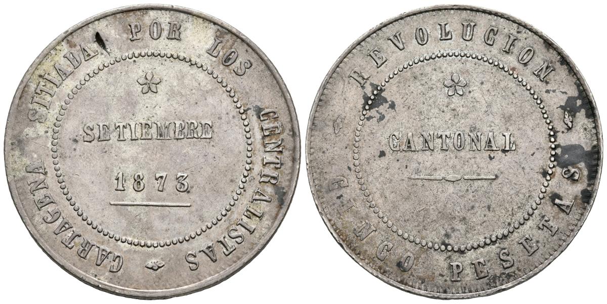 REVOLUCION CANTONAL. 5 Pesetas. 1873. Cartagena (Murcia). No coincidente. Cal-6. Ar. 27,97g. Manchitas. Fallito del metal en reverso. MBC.
