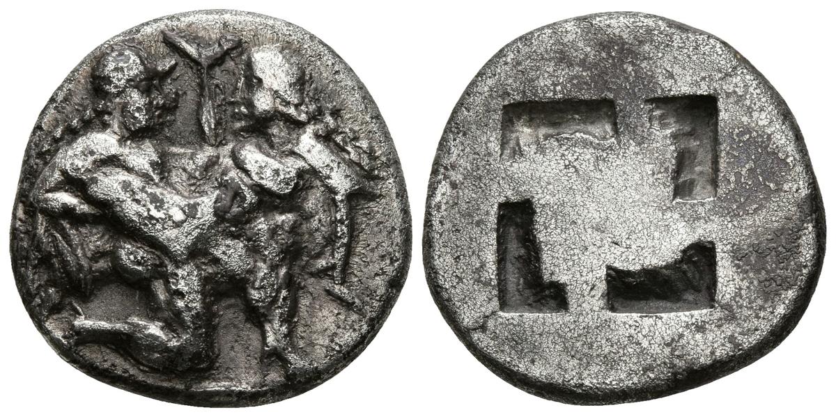 THASOS, Thracia. Estátera. 500-480 a.C. A/ Sátiro itifálico avanzando a derecha y sosteniendo a Ninfa en sus brazos. R/ Cuadripartito incuso. SNG Copenhagen 1008-9; HGC 6, 331. Ar. 7,45g. MBC.