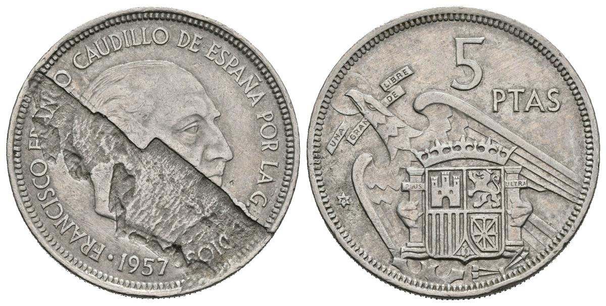 ESTADO ESPAÑOL. 5 Pesetas . 1957 *75. Importante hoja en anverso. Cal-66. Cu-Ni. 5,60g. MBC.