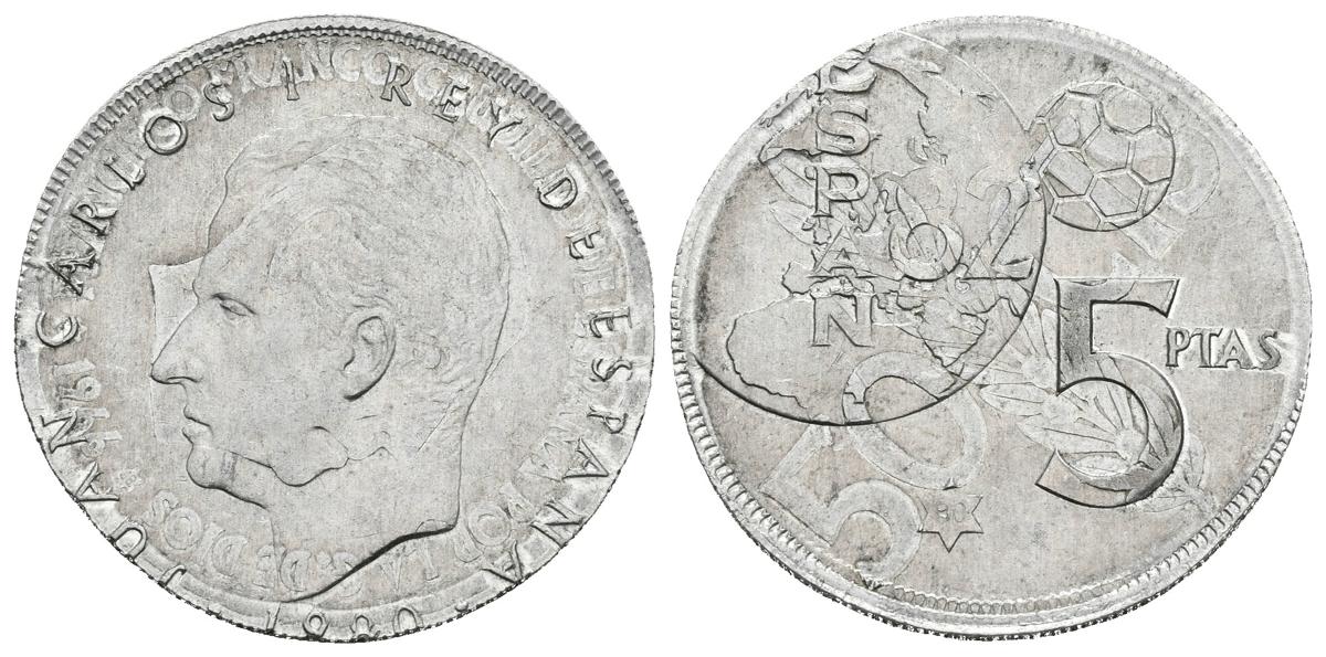 JUAN CARLOS I. 5 Pesetas. 1980 *80. Acuñada sobre cospel de 50 Céntimos. Cal-125var. Al. 0,99g. EBC+.