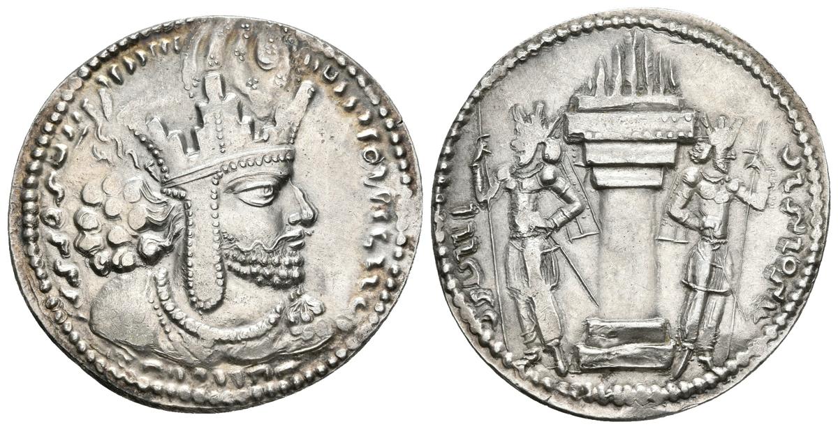 IMPERIO SASANIDA. Shapur I. Dracma. 240-727 d.C. Ceca: Ctesiphon. A/ Busto de shapur con corona y drapeado a derecha. R/ Altar en llamas flanqueado por dos asistentes con lanzas. Göbl Type III/1. SNS I Type IIc/1a. Ar. 4,39g. Magnífico ejemplar. EBC+.