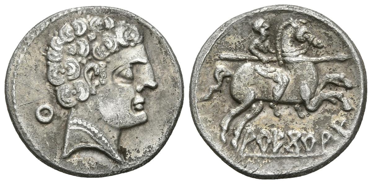 ARECORATAS. Denario. 150-20 a.C. Agreda (Soria). A/ Cabeza masculina a derecha con torque doble, detrás letra ibérica Cu. R/ Jinete con lanza a derecha (dos pies visibles), debajo ARECoRATa. FAB-105. Ar. 3,91g. Algo porosa. MBC+.