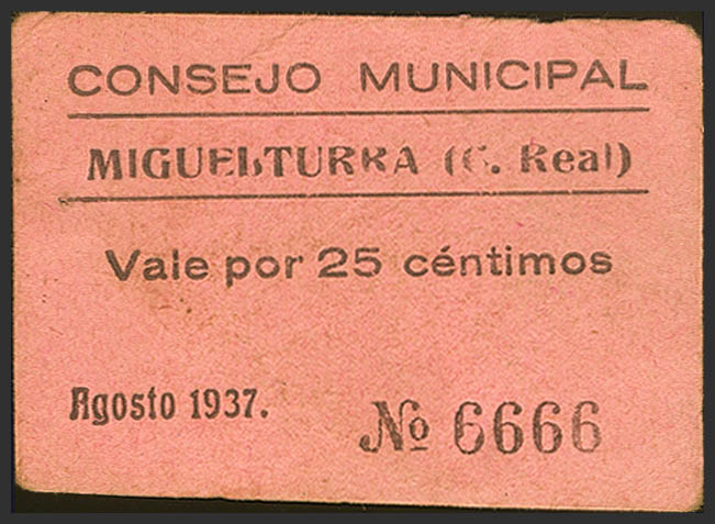 MIGUELTURRA (CIUDAD REAL). 25 Céntimos. Agosto de 1937. (González: 3536). Muy raro. EBC.
