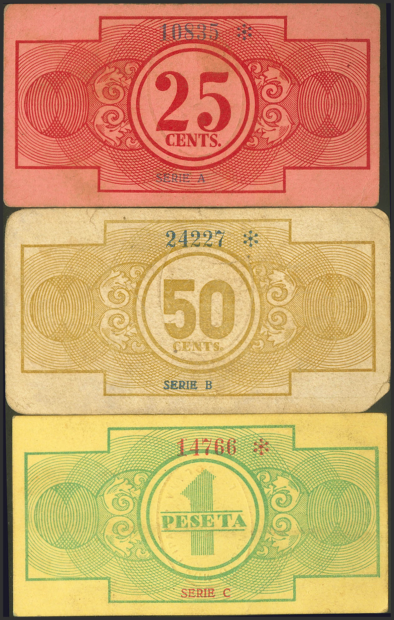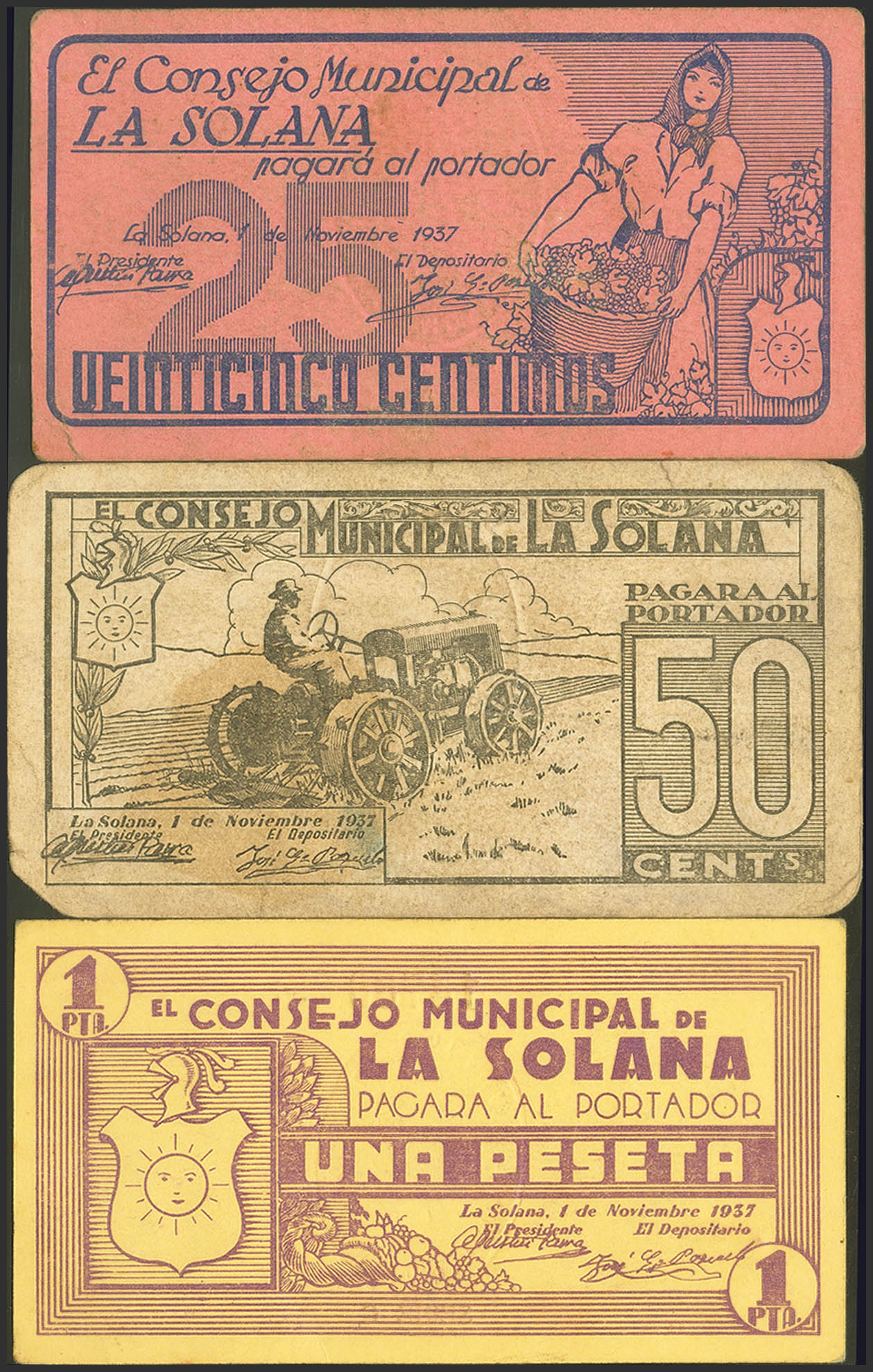 LA SOLANA (CIUDAD REAL). 25 Céntimos, 50 Céntimos y 1 Peseta. 1 de Noviembre de 1937. Serie A, B y C, respectivamente. (González: 4888/90). Inusual serie completa. EBC++/MBC+.
