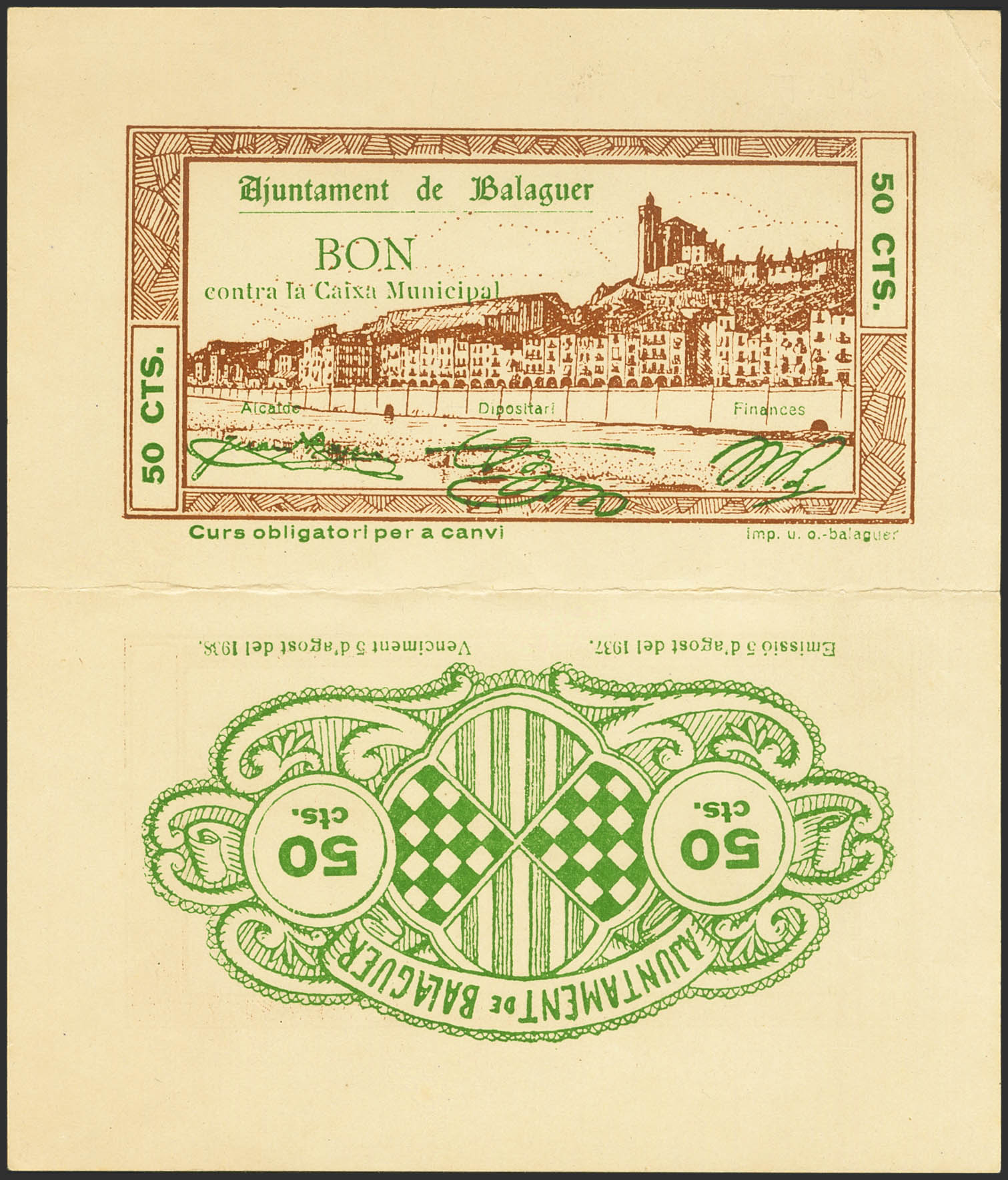 BALAGUER (LERIDA). 50 Céntimos. 5 de Agosto de 1937. (González: 6487). Rara maculatura, en pareja sin guillotinar, muy espectacular. SC.