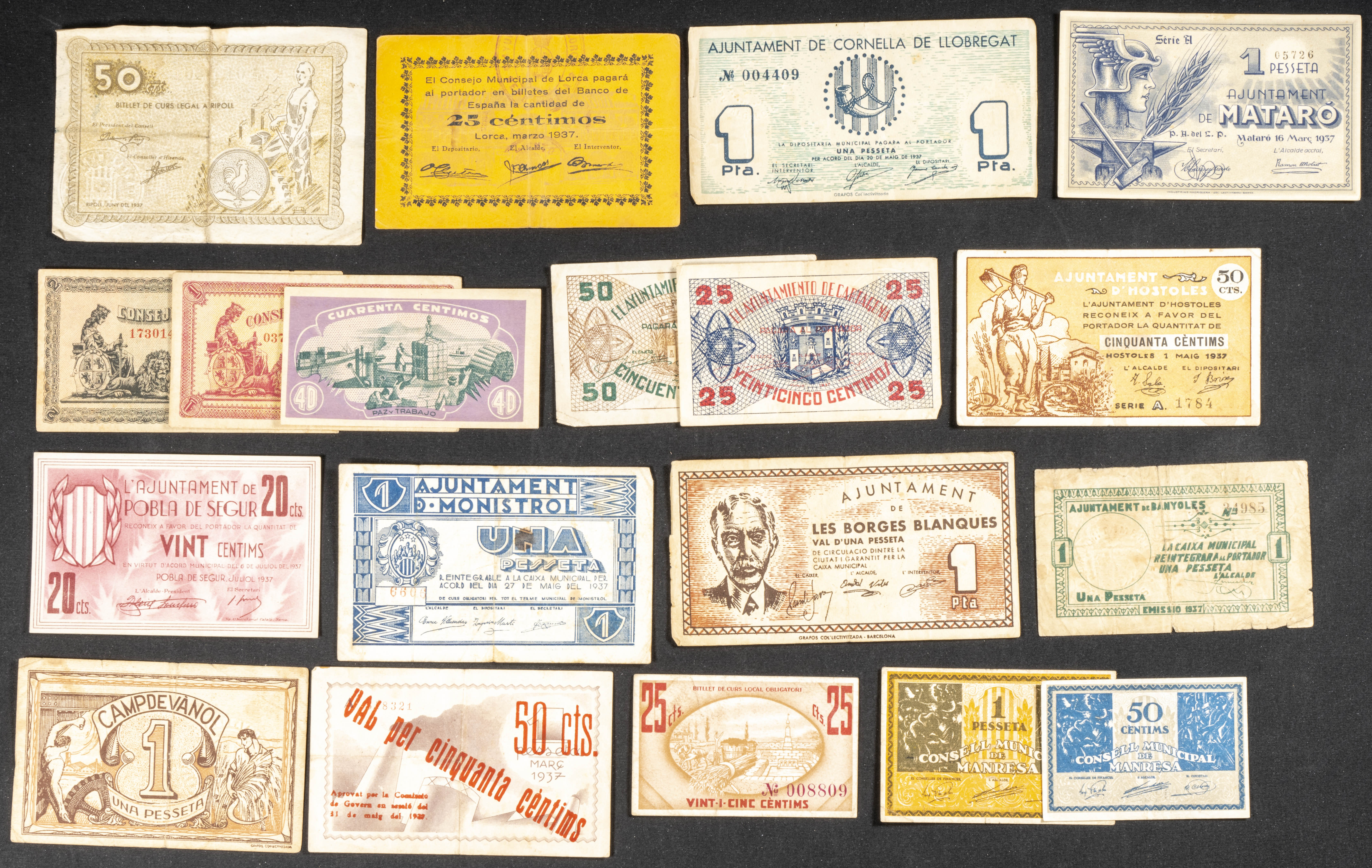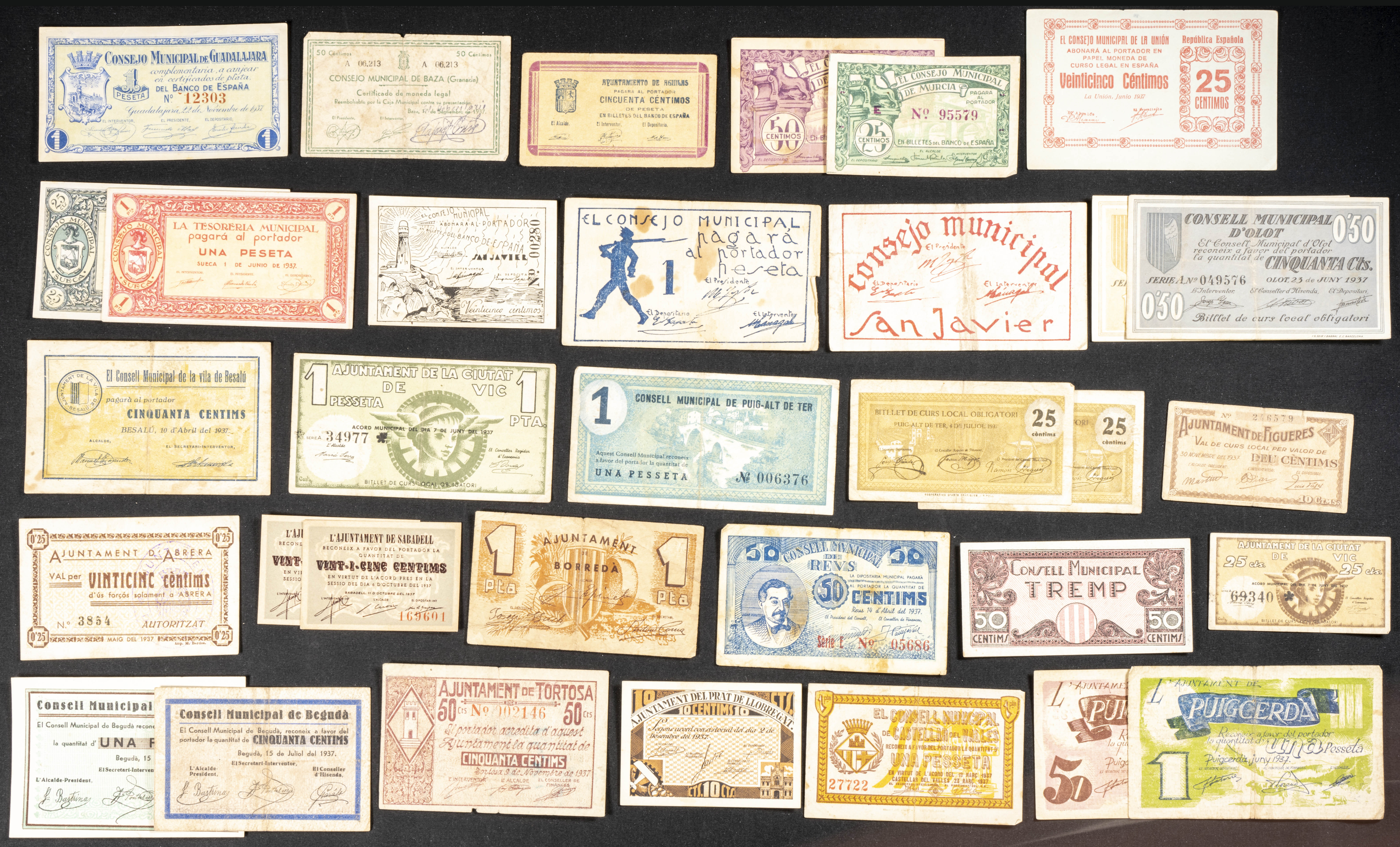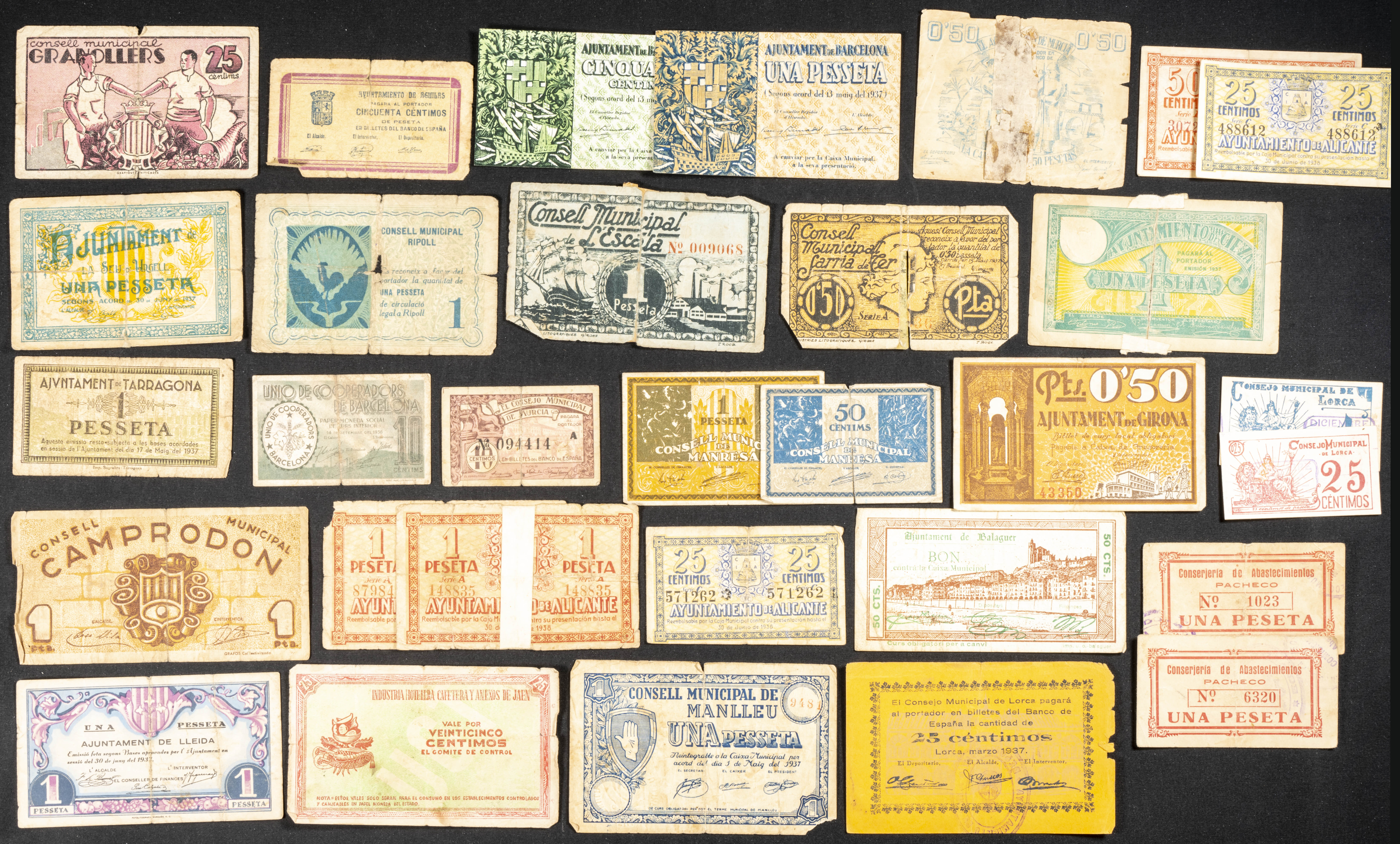 Conjunto de 83 billetes de la Guerra Civil, de diferentes localidades y en diversas calidades. A EXAMINAR.