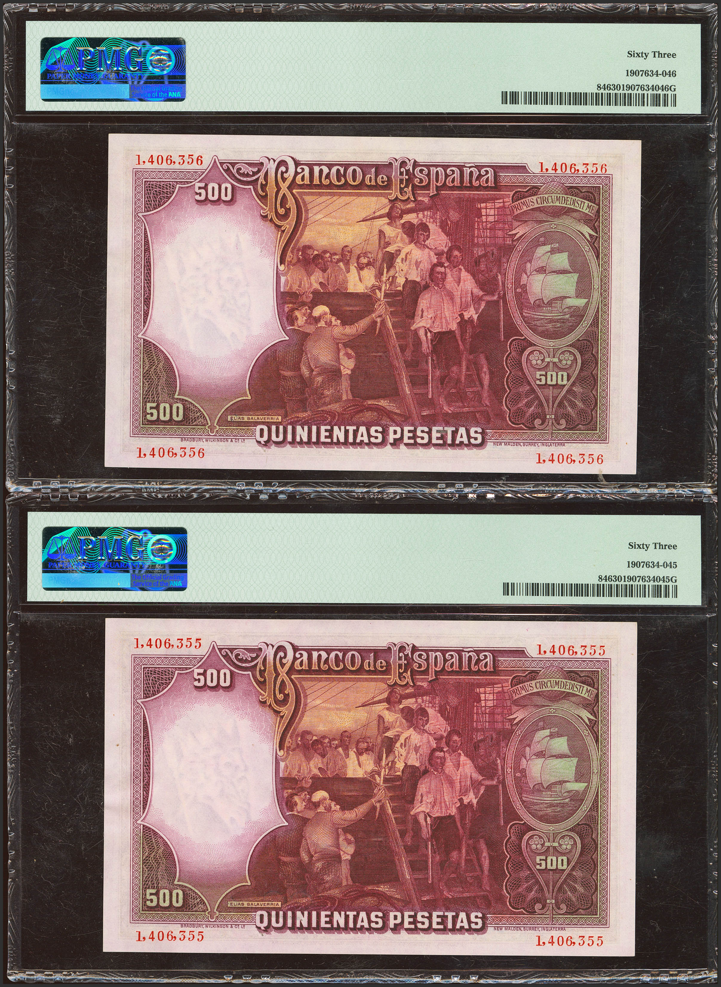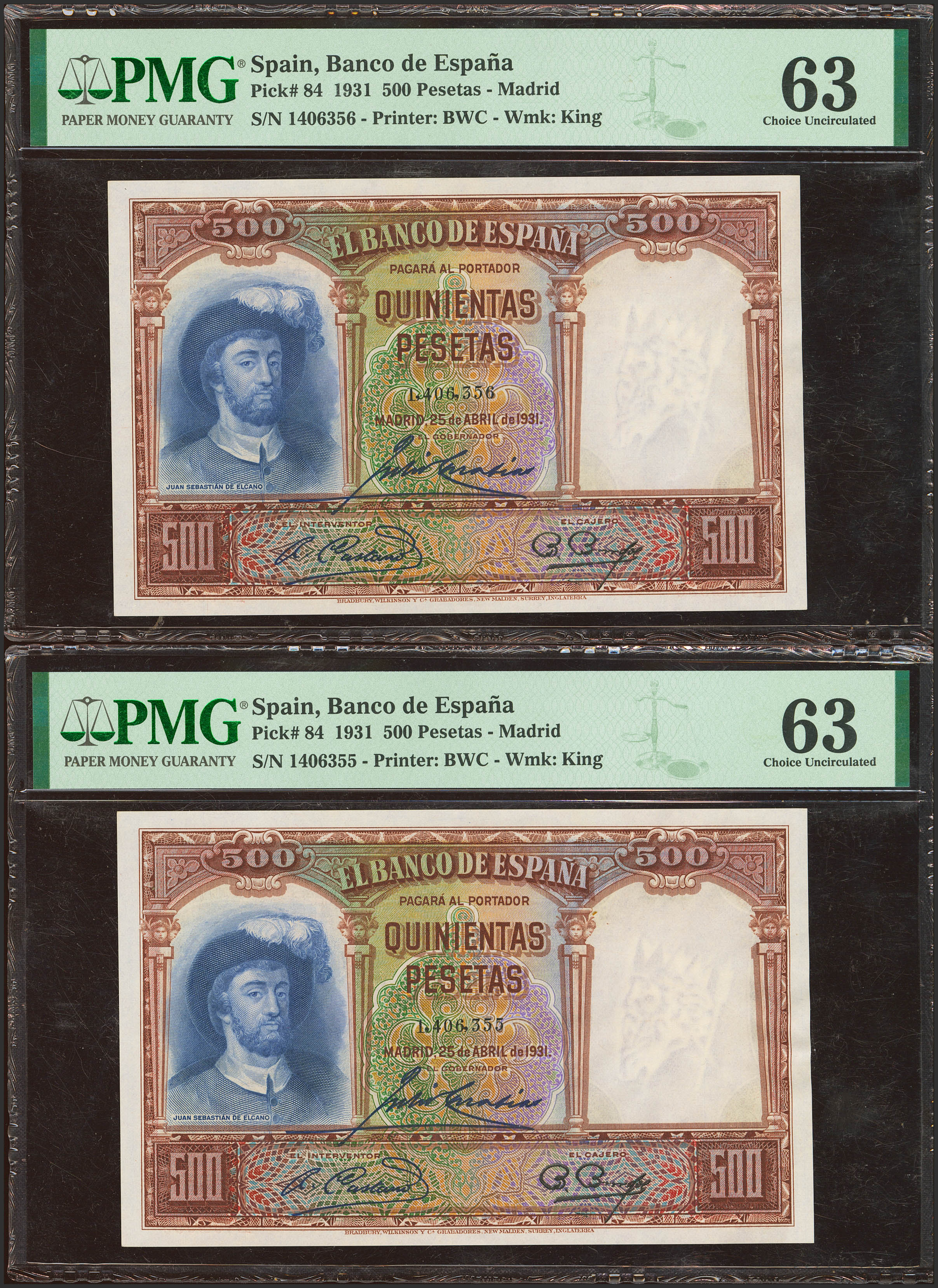 500 Pesetas. 25 de Abril de 1931. Pareja correlativa. Sin serie. (Edifil 2021: 361, Pick: 84). SC. Encapsulados PMG63, ambos.